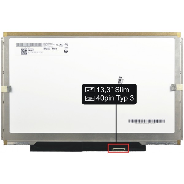 Hauptdaten: glänzend Oberfläche, Größe 13,3", Auflösung 1280x800, LED Hintergrundbeleuchtung, 40 Pin LED Verbindungsstecker am Display rechts unten (beim Blick auf die Display-Rückseite).