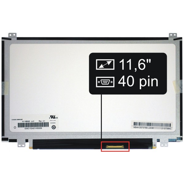 Hauptdaten: glänzend Oberfläche, Größe 11,6", Auflösung 1366x768 HD FHD, LED Hintergrundbeleuchtung, 40 Pin LED Verbindungsstecker am Display rechts unten (beim Blick auf die Display-Rückseite).